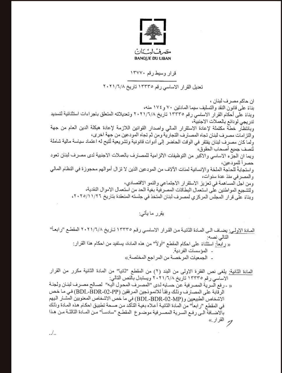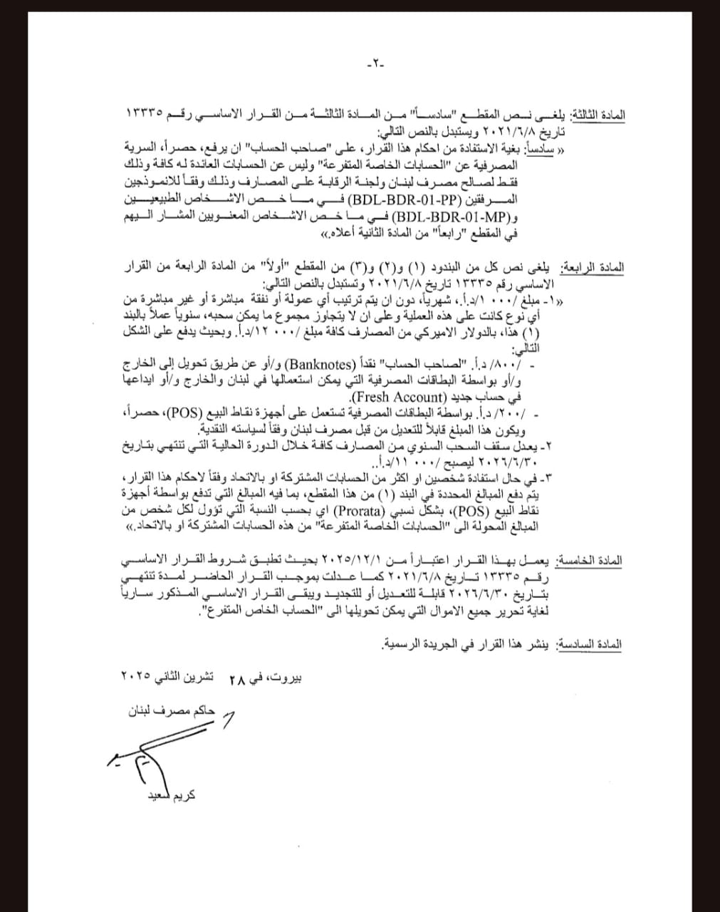 أصدر مصرف لبنان اليوم الجمعة، تعميمًا بشأن رفع سقف السحوبات الشهرية.