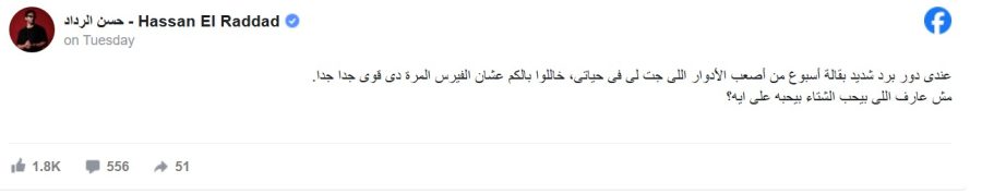 كشف الفنان حسن الرداد أنه تعرض لوعكة صحية كبيرة مؤخراً، وذلك عبر منشور على حسابه الشخصي على موقع التواصل الاجتماعي فيسبوك.
