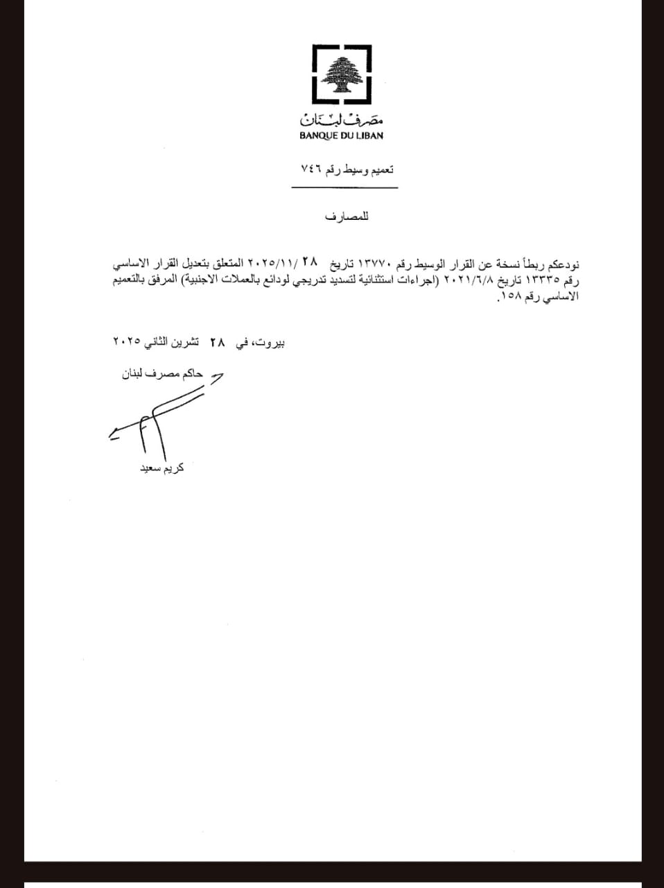 بشأن رفع سقف السحوبات الشهرية.. إليكم هذا التعميم من مصرف لبنان